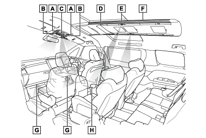 - ルームランプ(→ルームランプを操作するには)/フロントパーソナルランプ(→フロントパーソナルランプを操作するには)