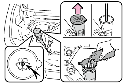 ハイブリッドシステムが熱いときやハイブリッドシステムが作動しているときは、ウォッシャー液を補充しないでください。