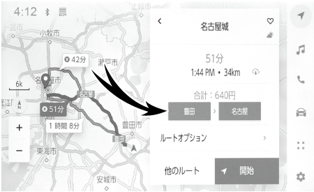 目的地を設定したあと、全ルート図表示画面に表示されている出口IC・入口ICを1カ所ずつ指定することができます。