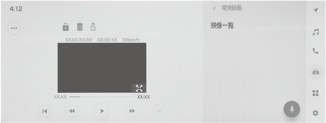 - [手動録画]、[イベント録画]または[駐車中の録画]を選択した場合、[映像一覧]、[録画地点]のいずれかにタッチします。[映像一覧]:録画された日付・時刻の新しい順(1分単位)に表示されます。サムネイル一覧から再生したい映像にタッチします。[録画地点]:撮影された地点が地図上にアイコン表示されます。再生したい地図上のアイコンにタッチします。※: