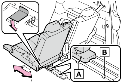 シート固定ベルトの上下のツメを押してはずし、シートクッション裏側に格納します。