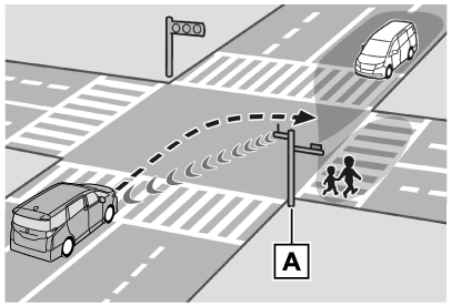 DSSS用路側装置が設置された交差点であっても、DSSS用路側装置の種類や交差点に進入する方向によっては、対向車のみを検知し、歩行者に対する注意喚起をしない場合があります。