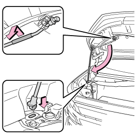 ボンネットステーをステー穴から取りはずし、クリップに正しくもどしてください。ステーを正しくもどさない状態でボンネットを閉めると、ボンネットやステーが損傷するおそれがあります。