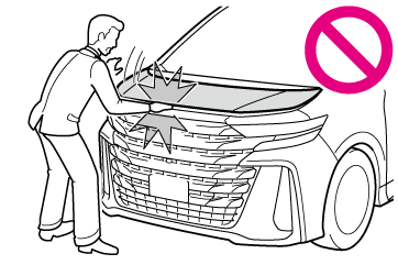 ボンネットを閉めるときは、体重をかけるなどして強く押さないでください。ボンネットがへこむおそれがあります。