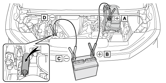 - 電子キーを携帯していることを確認するブースターケーブル接続時、場合によっては、オートアラームが作動し自動的にドアが施錠されます。(→オートアラーム作動によるドアロック機能)