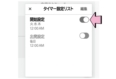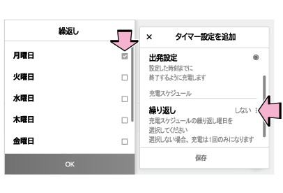 ご希望の曜日を選択することで、繰り返しタイマー充電が行われるように設定できます。(曜日を選択しない場合は、1回のみ充電が実施されます)