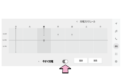 充電スケジュールがひとつでも登録されていると、車両に普通充電ケーブルを接続しても、タイマー充電の設定時刻まで普通充電が開始されません。充電スケジュールの登録内容を変更することなく充電を行いたいときは、“今すぐ充電”をONにすることで、充電スケジュールが一時的に無効になり、普通充電ケーブル接続後、普通充電を開始することができます。