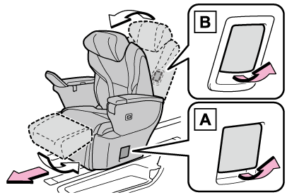 シートを調整しているときは、シートの下や動いている部分の近くに手を近付けないでください。指や手を挟み、けがをするおそれがあります。