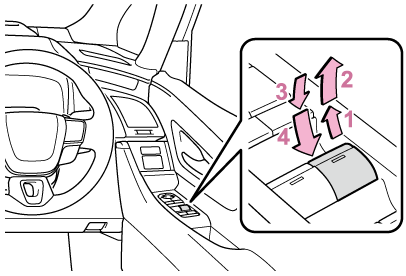 車を停止し、パワースイッチをONの状態で、挟み込み防止機能や、巻き込み防止機能が作動したあと約4秒以内に、パワーウインドウスイッチを「自動全閉」の位置で引き続ける。または、「自動全開」の位置で押し続けることでドアガラスを開閉することができます。