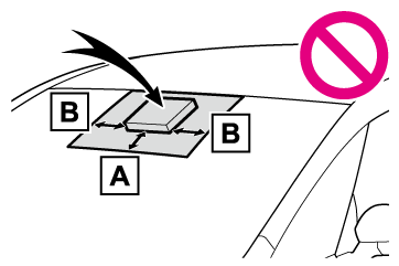 フロントウインドウガラスの前方カメラ前部(図に示す範囲内)にステッカー(透明なものを含む)などを貼り付けない