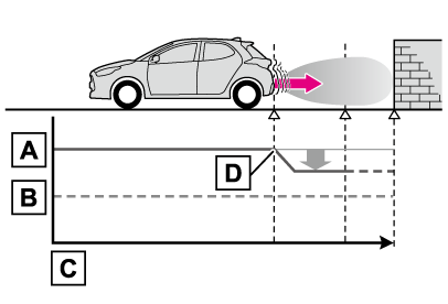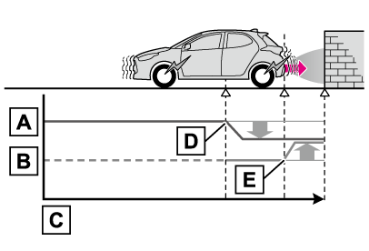PKSB(パーキングサポートブレーキ)は、衝突の可能性がある作動対象(壁などの静止物や後方接近車両)を検知したとき、エンジンの出力を抑制することにより車速の上昇を抑えます。(エンジン 出力抑制制御:図2)また、そのままアクセルペダルを踏み続けた場合は、ブレーキをかけ減速させます。(ブレーキ制御:図3)