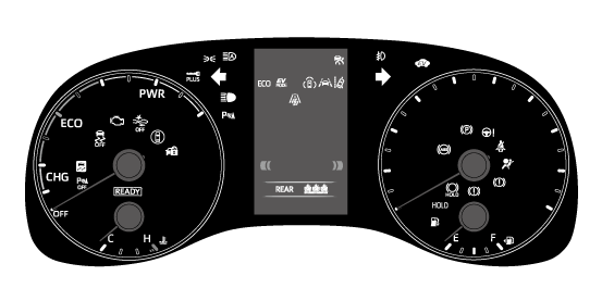 作動確認のためにパワースイッチをONにすると点灯し、数秒後またはハイブリッドシステムを始動すると消灯します。点灯しない場合や点灯したままのときはシステム異常のおそれがあります。トヨタ販売店で点検を受けてください。