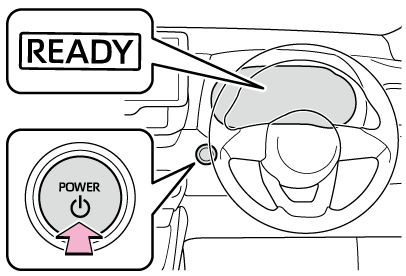 表示されないと、ハイブリッドシステムは始動しません。 - パワースイッチを短く確実に押す短く確実に押せば、押し続ける必要はありません。READYインジケーターが点灯すれば、ハイブリッドシステムは正常に始動しています。READYインジケーターが点灯するまでブレーキペダルを踏み続けてください。パワースイッチのどのモードからでもハイブリッドシステムを始動できます。