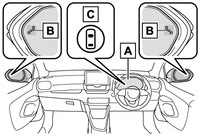 開いたドア(バックドアを除く)と衝突する可能性がある車両・自転車を検知したときは、検知した側のドアミラーインジケーター(→表示灯一覧)が点灯します。検知している側のドアを開いた場合は、ドアミラーインジケーターが点滅します。
