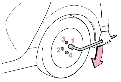4. ホイールナットレンチを使用し、図の番号順でナットを2、3度しっかり締め付ける