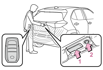 電子キーを持った手でパワーバックドア下部のクローズ&ロックスイッチ(→車外からスイッチ操作で開閉する)を押したとき