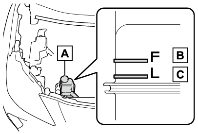 4. 冷却水の量がリザーバータンクの“F”(上限)と“L”(下限)のあいだにあるかを点検する